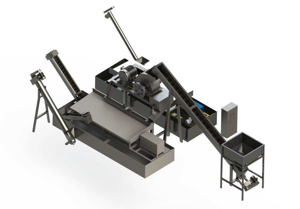 1.摇床金属分选线用于废旧电子料的分选回收,可将各类金属及塑料分别分离出来,此生产线主要包含设备有储料罐、上料螺杆机、锤破机、摇床,整线占地面积110 平方米。